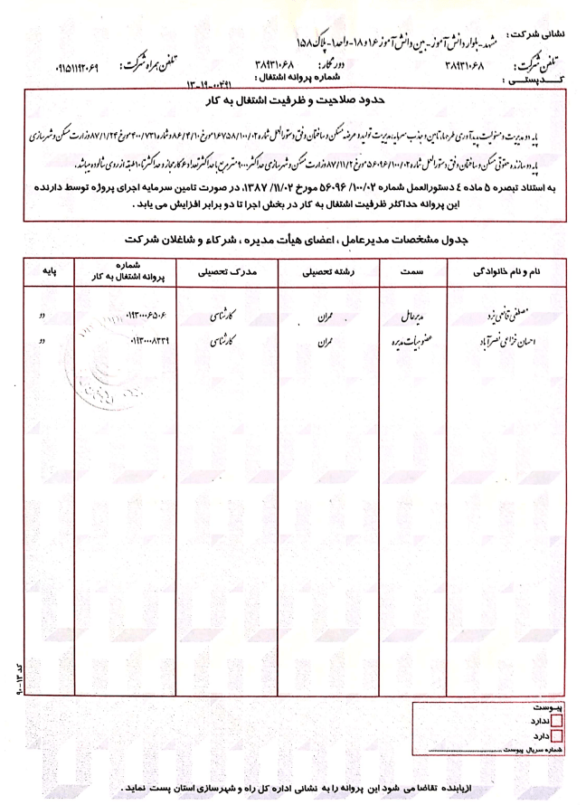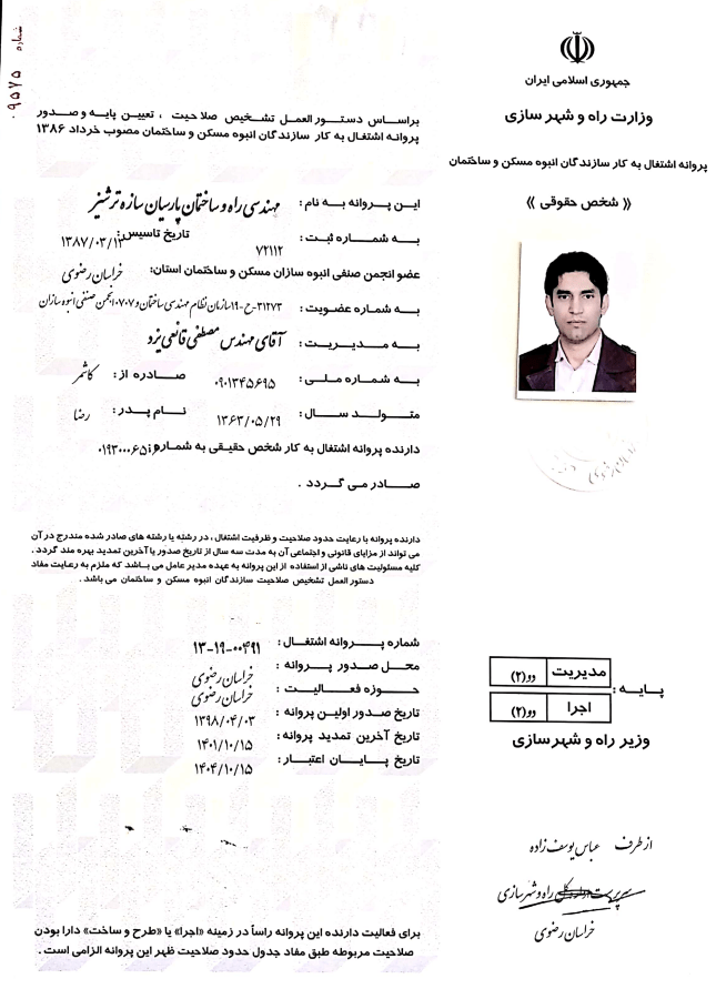 پروانه انبوه سازی شرکت مهندسی راه و ساختمان پارسیان سازه ترشیز